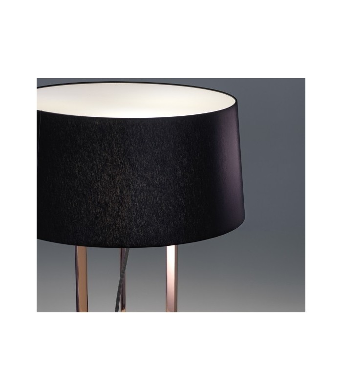 Leds C4 Premium floor lamp consists of a steel frame, made up of three rods painted in copper finish, and of a circular base painted in black. The round lampshade in PMMMA, covered in black fabric and closed at the top, is designed to shield the bulbs and to spread light homogeneously, also upwards, without glaring.