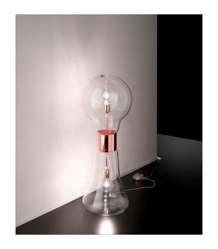 Contemporary revival of the Seventies style of the Murano blown glass. The lamp has two separate power buttons for the base and the bulb – which has a dimmer. Its diffusers are available in different colours or in clear glass. The junction element is in polished copper.