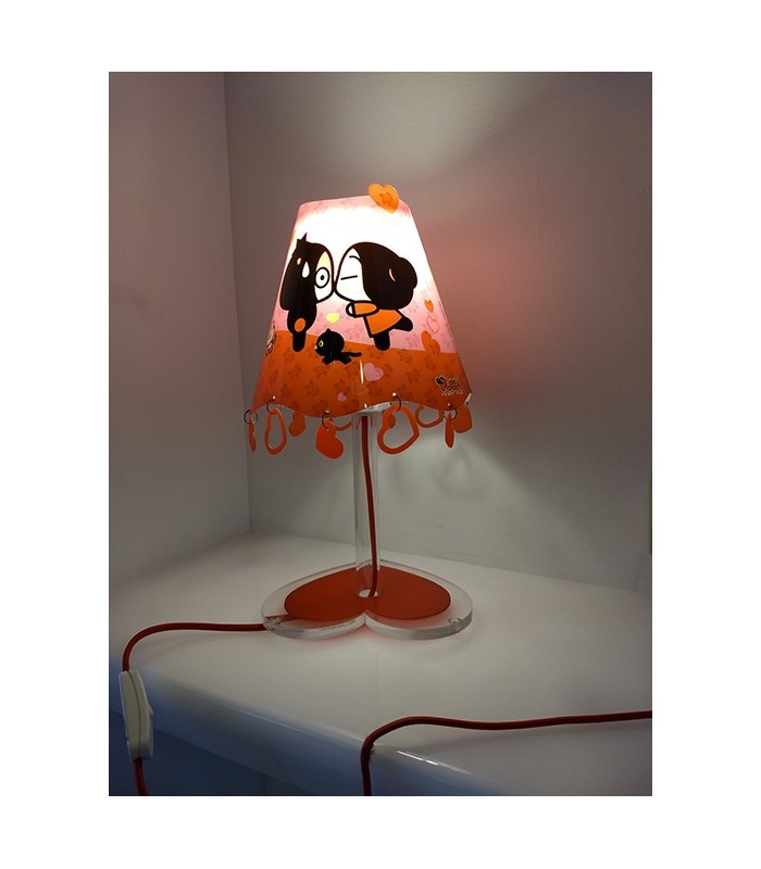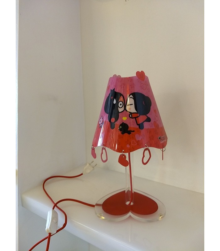 The Pucca bedside table or table lamp consists of a heart-shaped base in transparent and red polycarbonate and a colored polycarbonate lampshade characterized by heart-shaped applications. The stem, in transparent tubular polycarbonate, allows you to see the power cable, in red fabric, set inside.