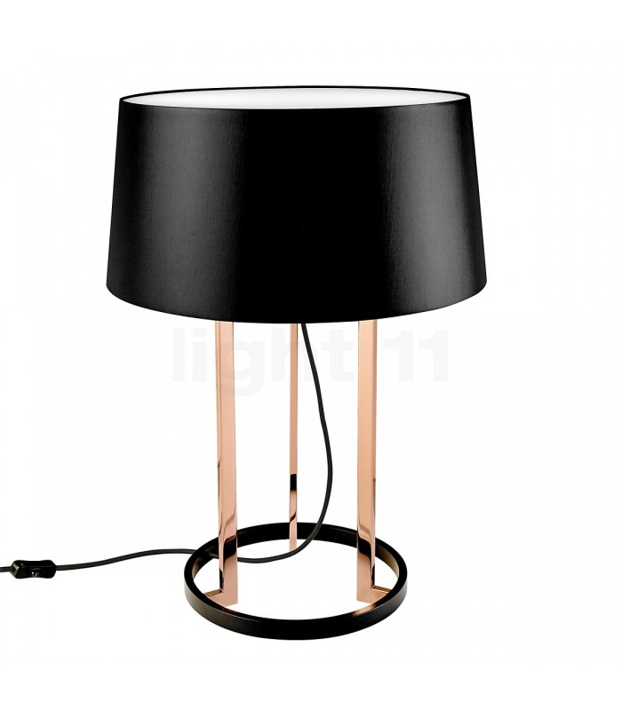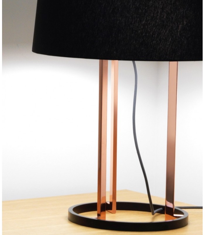 Table or dresser lamp featuring steel frame, available in copper finish, and black base. Lampshade in PMMMA enclosed at the top and covered in black fabric.