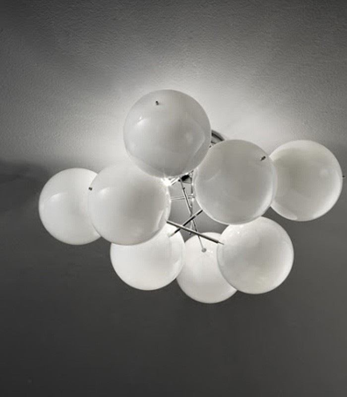 The Atom ceiling lamp version by Metallux comes in two sizes, the Small size is characterized by a diameter measuring 40 cm, two lights and eight spheres, while the Medium size is characterized by a diameter measuring 55 cm, four lights and eight spheres.