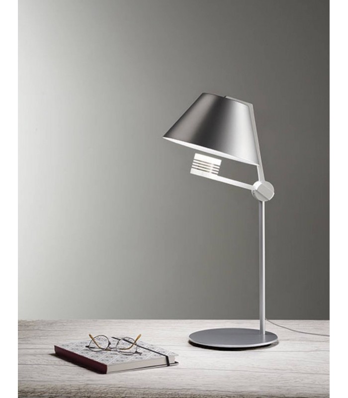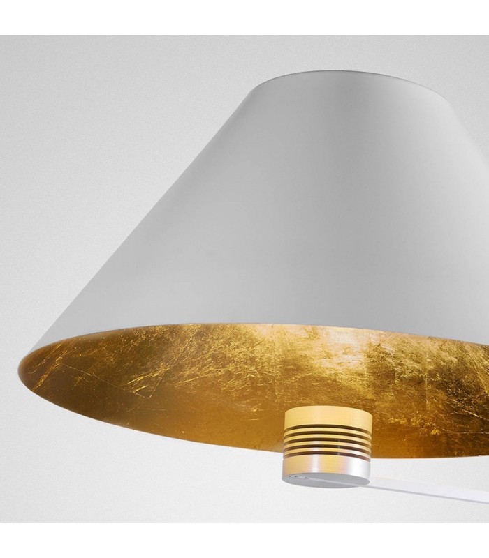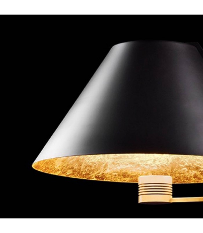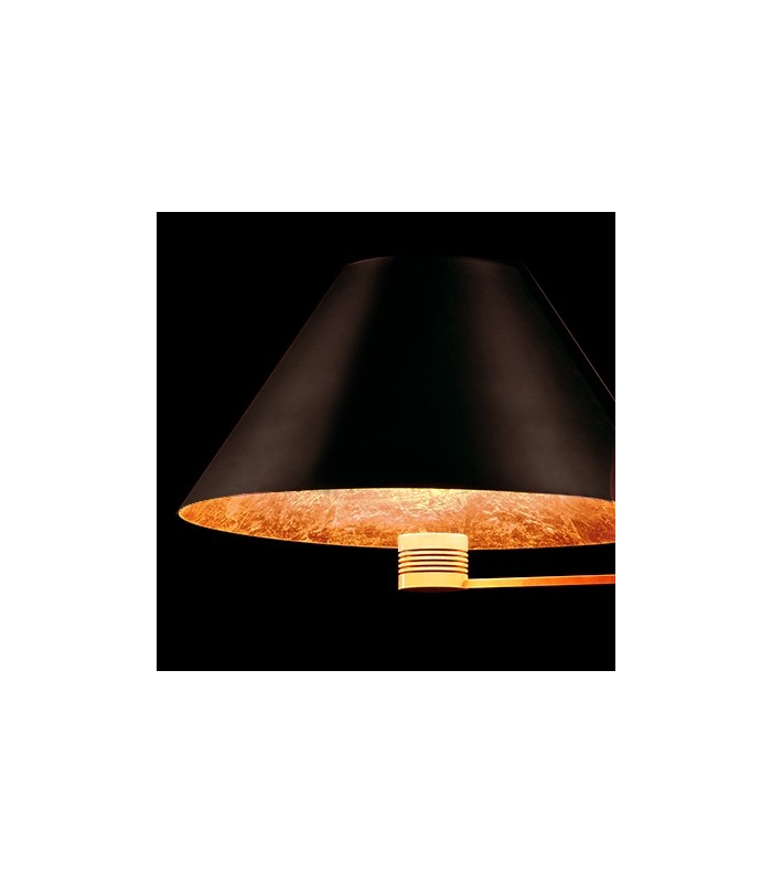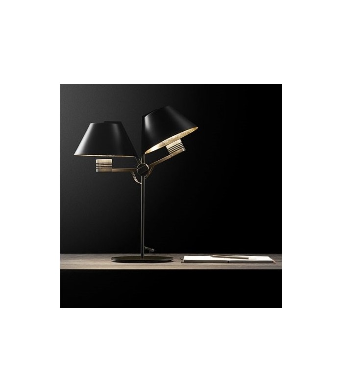 Cinema is a table lamp available with one or two lights. The lamp consists of a metal frame finished in various colors: black with gold leaf interior, white with gold leaf or white interior, aluminum with aluminum interior and bronze with copper leaf interior. A LED spotlight is set inside the diffuser to illuminate its inside part and to enjoy the pleasure of a reflected, soft and inviting light emission.