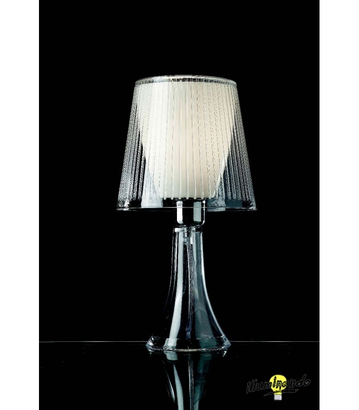 Table or bedside table lamp consisting of acrylic base and diffuser and details in chromed metal. Available in two sizes and various colors.