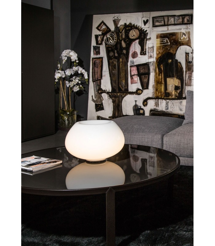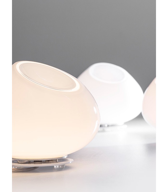 Eyes by Mazzega 1946 is a table or bedside table lamp made up of a base and a frame, in white painted metal, enriched by a precious handmade white glass diffuser. A spherical shape, open at the top, inspired by the bowl of the Curling game.