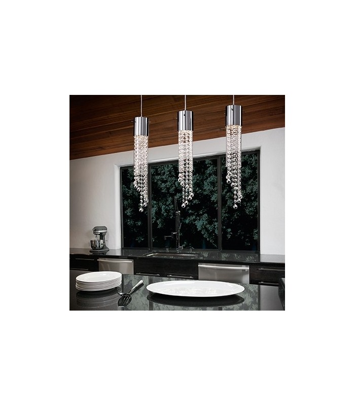 Suspension lamp in chrome metal frame and glass tubular diffuser with crystals.