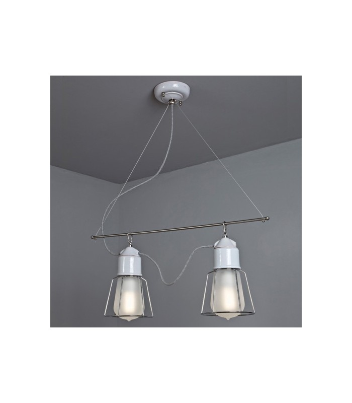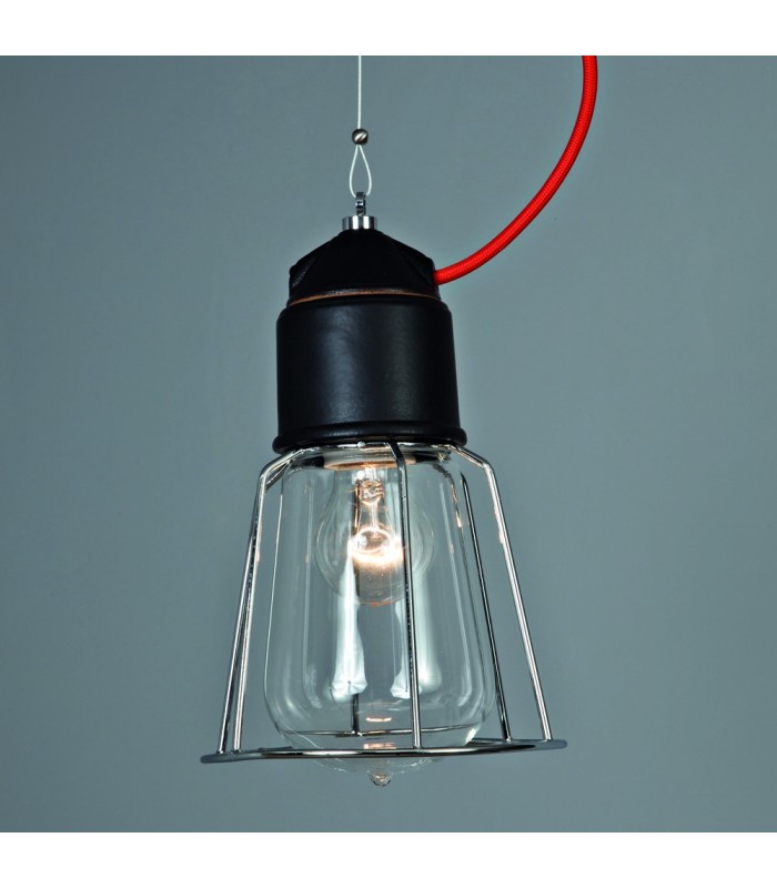 Pendant lamp with ceramic element, version with metal cage, available in different colors.
