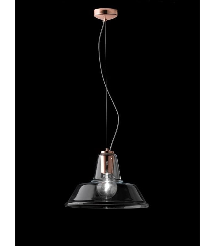 Lampara features a metal frame, finished in chrome or in a galvanic copper to meet your requirements, and a diffuser in handmade and transparent blown glass that fascinates with its soft and diffuse light emission.