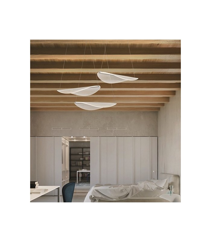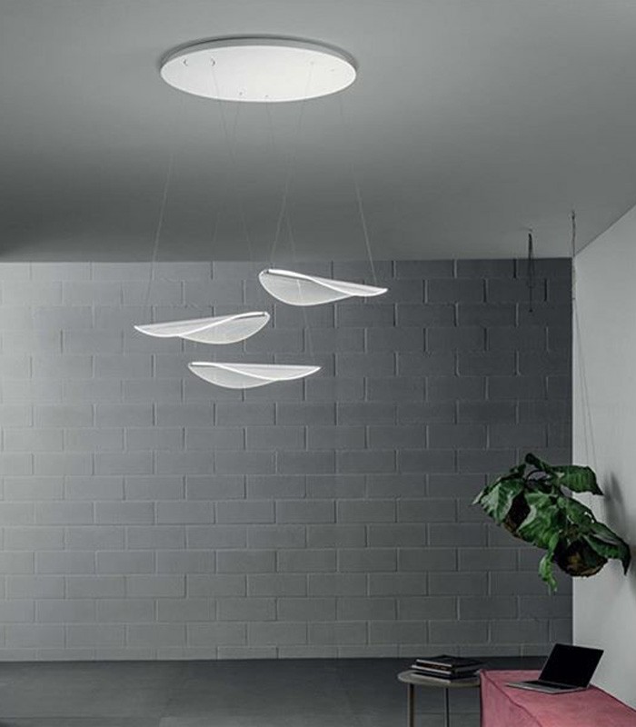 Stilnovo Diphy suspension lamp consists of three leaves that enlighten the surrounding environment with direct and diffuse light. The lamp features a white painted aluminum frame and three PMMA diffusers subjected to the process of screen printing and based on Optilight Technology (Tm). A thin white aluminum bar, set inside each leaf, contains the LED light source which turns a bright light emission into refined beauty.