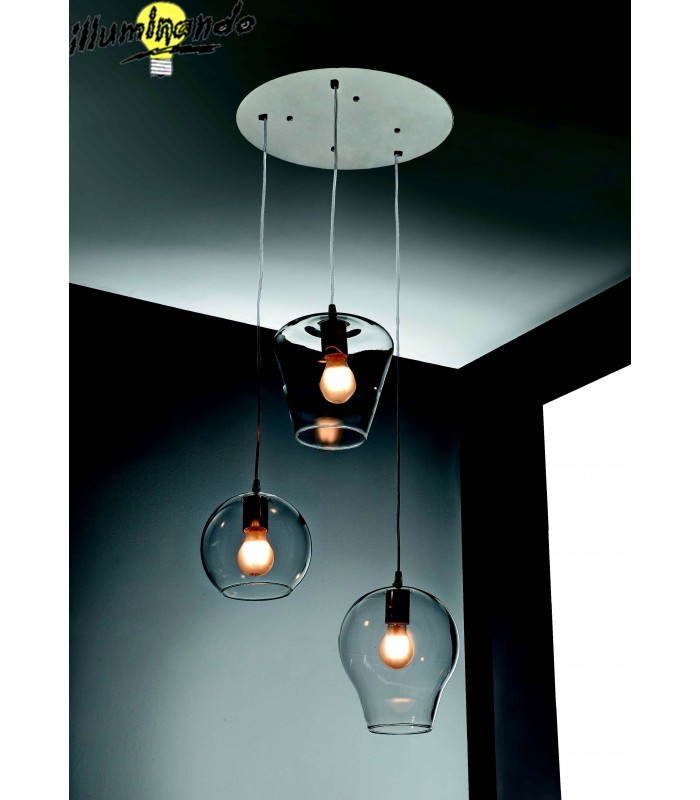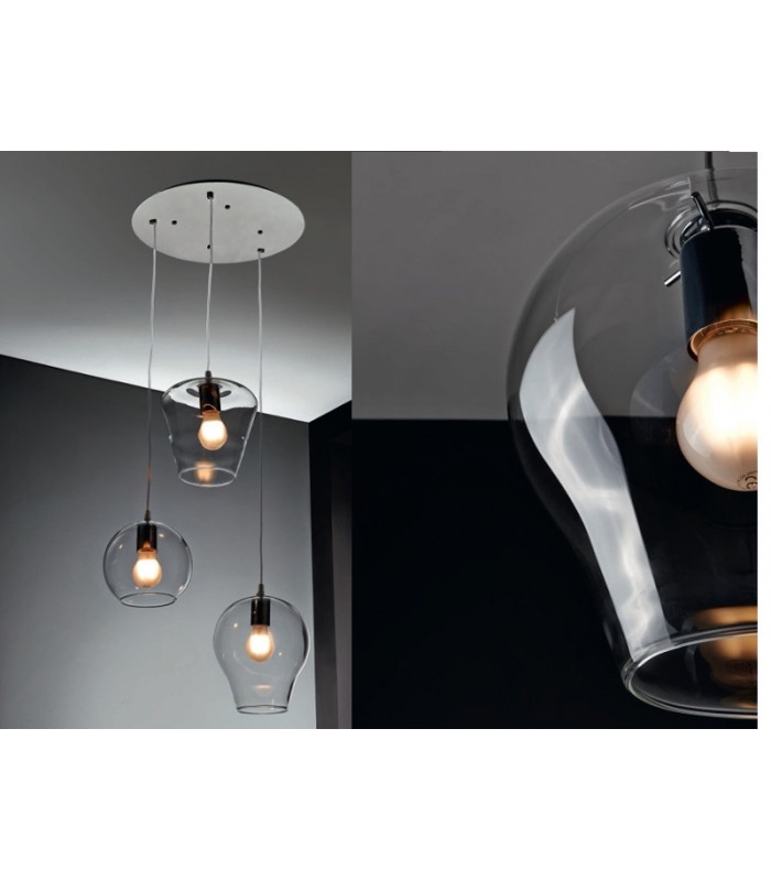 The Pagoda suspension lamp consists of three diffusers in transparent borosilicate glass, having different diameter and shape. The smallest one has a 18 cm diameter, the medium one has a 19 cm diameter and the large one has a 20 cm diameter. The circular metal frame that houses the three elements can be finished in chrome, with transparent power cabling, or in rust color, with a brown braid power cable.