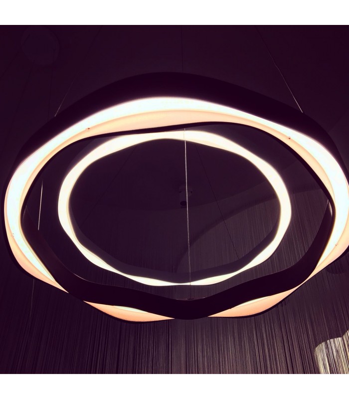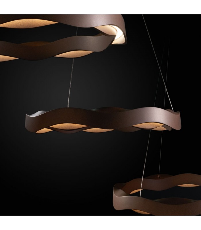 Grok Hello suspension lamp consists of a metal frame and of a circular diffuser made up of two shaped bands in PMMA and available in white and rust color. Thanks to its sinuous and floating shapes, this tasteful lamp reveals the fascination of a direct and diffuse light emission that can penetrate the darkness and give any given space new identity and appeal.
