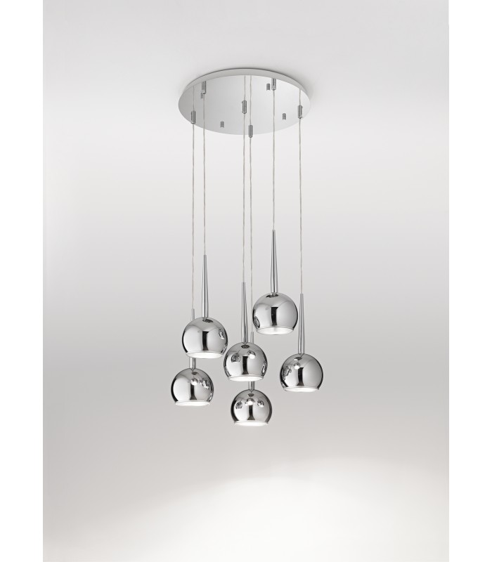 The Bol six-light suspension lamp consists of a chromed metal frame enriched by a mirrored finish while the chromed metal spotlight, set in the inside, features a sandblasted finish thought to achieve an extremely harmonic distribution of light in the surrounding space without glaring.