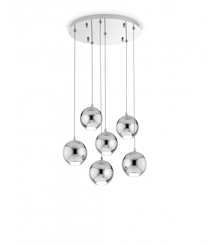 The BolDiodi six-light suspension lamp consists of a chromed metal frame, enriched by a mirrored finish, which houses the 18W LED light source with 3000K color temperature.