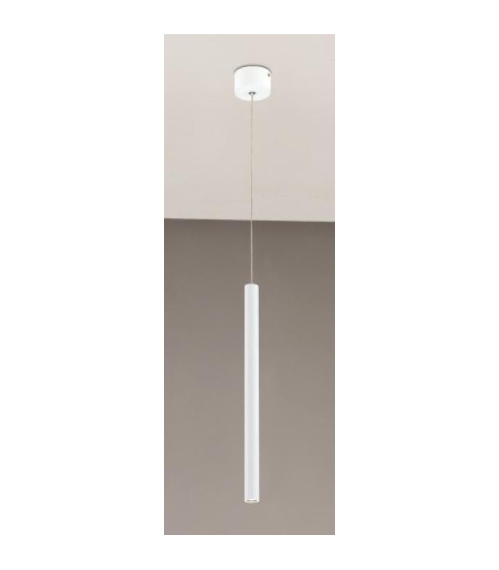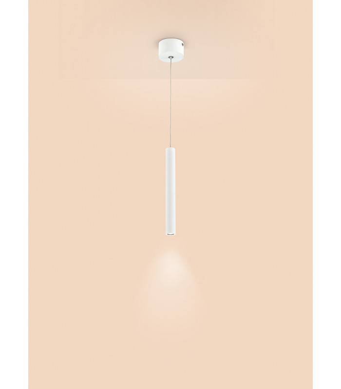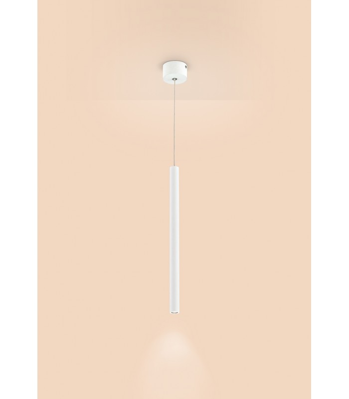 This stylish lamp stands out for its tubular metal frame painted in white and enriched by a refined and sophisticated sandblasted finish.
