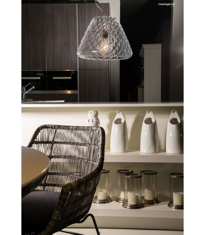 Thanks to this particular processing, the Snifter suspension lamp stands out for its excellent performance in terms of light output and aesthetic taste. Its soft and diffuse emission results in games of lights and shadows, rich in enchanting reflections, and the transparency of the crystal gives your environments lightness, identity and sophisticated appeal.