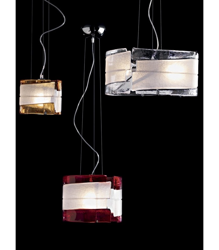 The Radius suspension lamp by Mazzega 1946 comes in three colors: transparent crystal with white central band, transparent red and white and transparent amber with white central band.