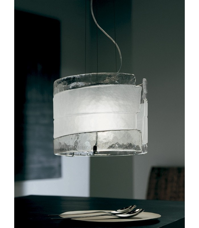Radius by Mazzega is a tasteful suspension lamp consisting of a polished chrome metal frame and a circular hand-made crystal diffuser. The stunning craftsmanship of the glass creates an extremely refined and impressive optical effect even when the lamp is switched off.