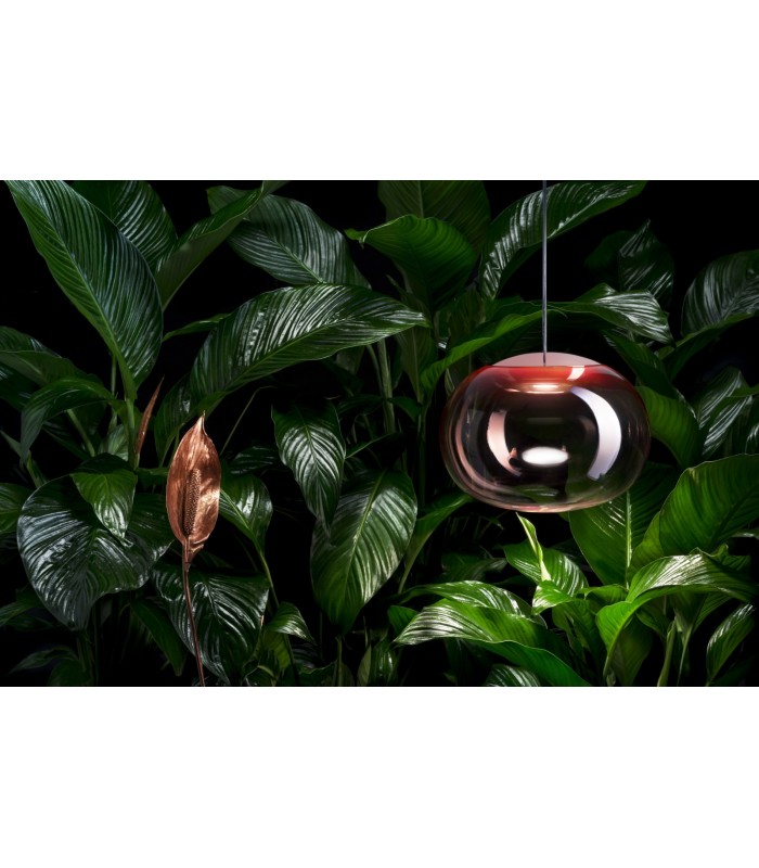 This refined and small suspension lamp consists of a spherical diffuser in blown glass available in the transparent glass version or in the version in smoked, gold or copper colors.