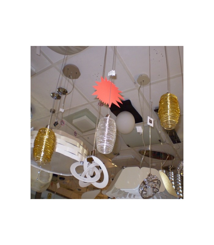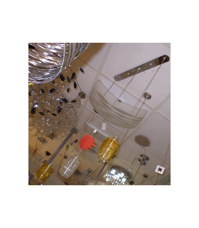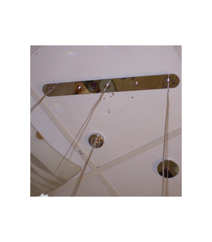 three lights supension lamp on bar cm 60 long and cm 6 wide , adjustable height from a minimum of 30 cm up to110 cm. ; 3xG9 75w energy saver.