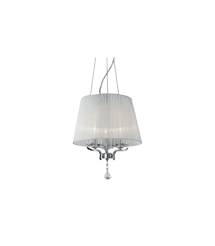 Suspension lamp in chrome enriched by central body, pendants and bobeches in cut crystal. Organza fabric lampshades. Chain cover in velvet. It is equipped with adjustable steel wires with automatic device. Its refined design is suitable for modern and contemporary environments, such as bedrooms, living rooms and conversation areas. This versatile collection includes suspension lamps, wall lamps, table and bedside table lamps and floor lamps. The organza lampshades are, by far, the most resistant to dirt and the most transparent. As a result, they make your environments brighter and more attractive.
