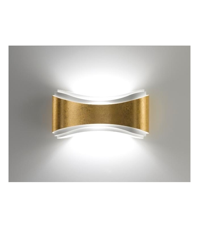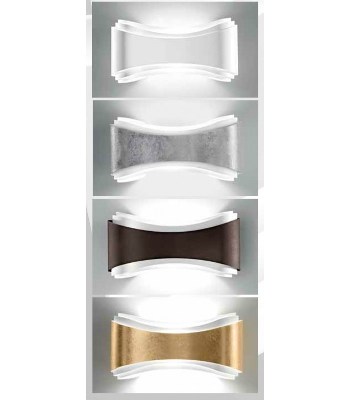 The Ionica wall lamp consists of a steel frame made of laser-shaped and skillfully hand-worked bands. The frame is painted in white color while the center band is available in white chalk, dark bronze, gold leaf and silver leaf. The new variants, finished in chromium and galvanized copper, are homogeneous in color, so they match the frame.