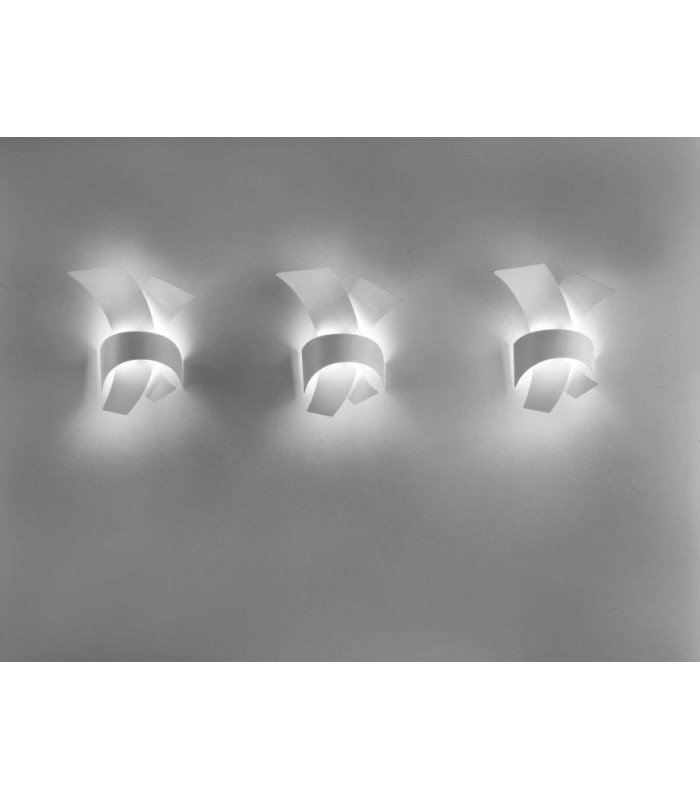 The Calypso wall lamp features a frame in worked, folded and white painted metal and a central strip available in white finishes.