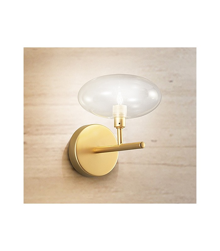 Wall lamp consisting of a metal frame, available in gold or chrome finish, and of a spherical diffuser in blown glass, available in white, transparent and white satin.