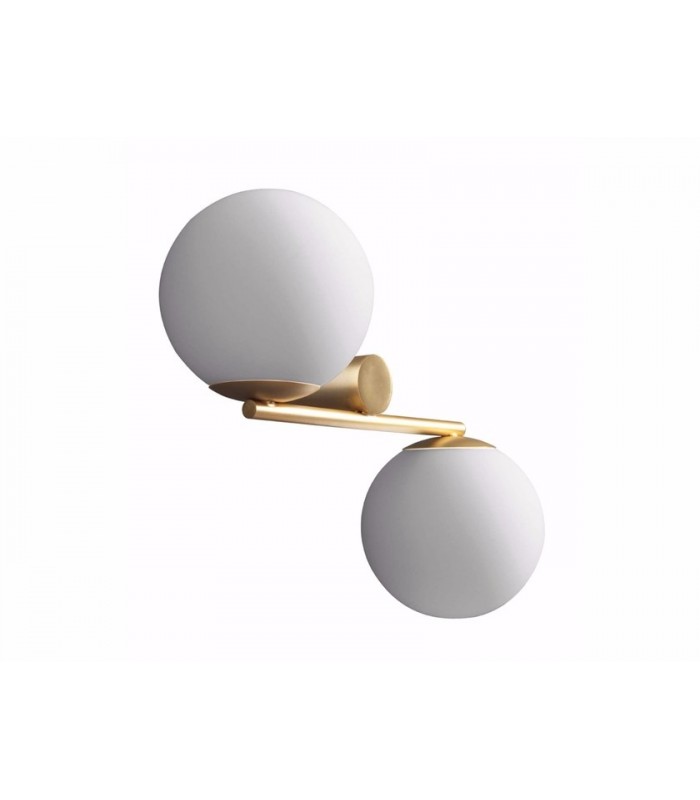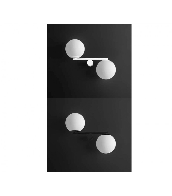 Two-light wall lamp with metal frame available in white, black and satin gold colors. Spherical diffusers in milk white glass.