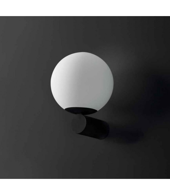Wall lamp with metal frame available in white, black and satin gold colors. Spherical diffuser in milk white glass.