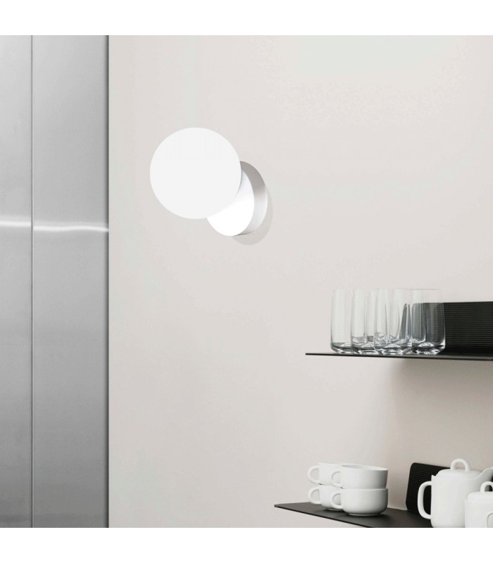 A tasteful and contemporary wall lamp that combines materials and shapes to create unique atmospheres. The Tin Tin wall lamp by Marchetti consists of a circular metal body and frame available in white, black or satin gold. The spherical diffuser in white glass balances the underlying frame where two circular and volumetric shapes coexist.