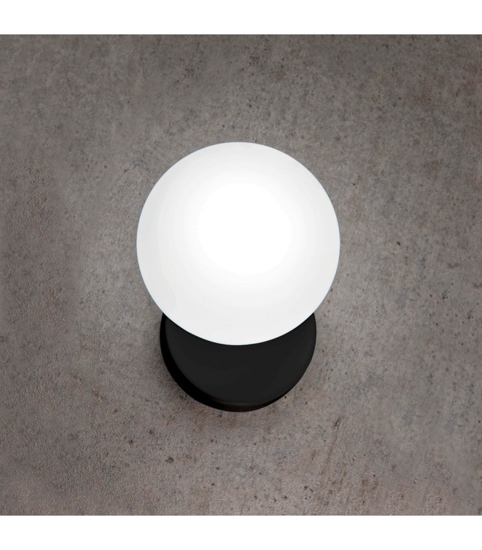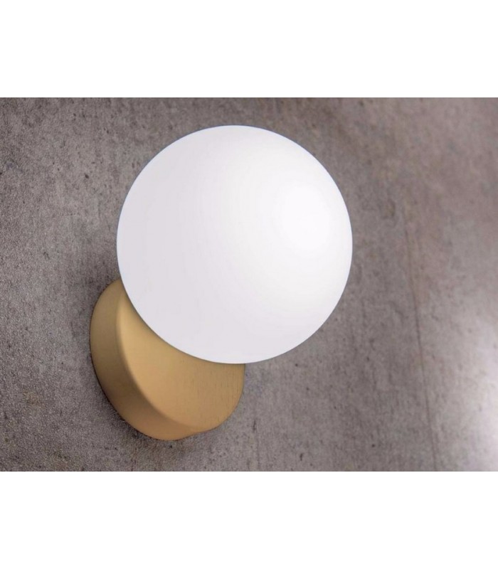 Wall lamp with metal body and frame available in white, black or satin gold. Spherical diffuser in white glass.