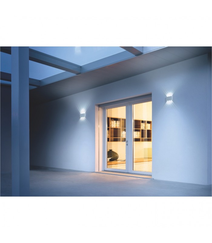 Fabo Redo is a wall lamp for exterior equipped with POWER LEDs, direct/indirect light distribution. Die cast aluminium housing electrostatically painted in mat white, transparent polycarbonate diffusers.