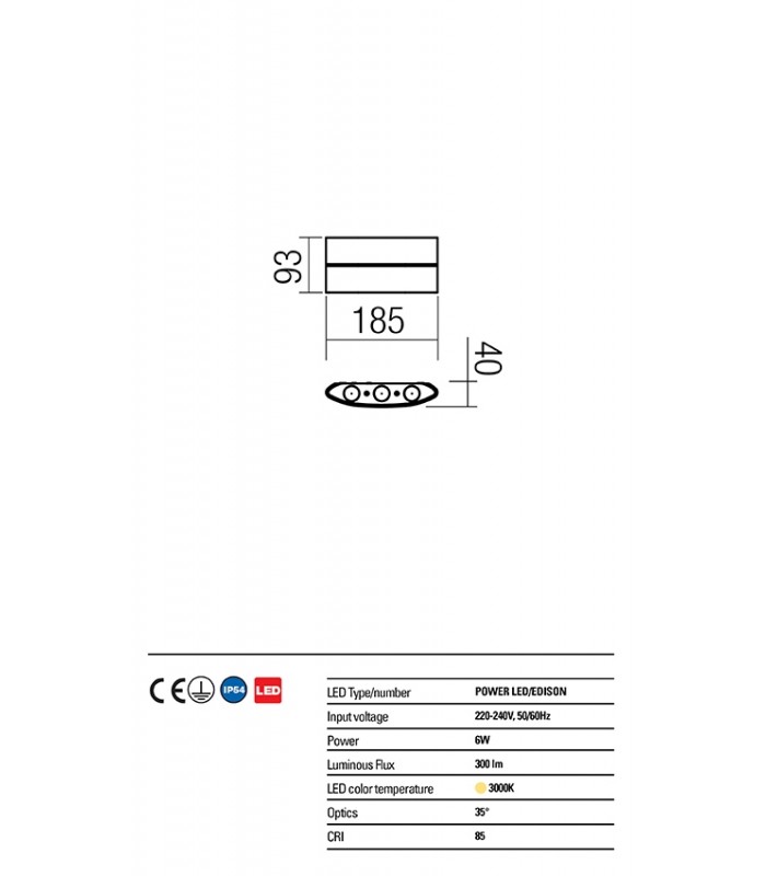 Fabo: L 18,5 cm, H 9,3 cm, Sp 4 cm - POWER LED EDISON 6W - 300lm - 3000K - CRI85 - 35°