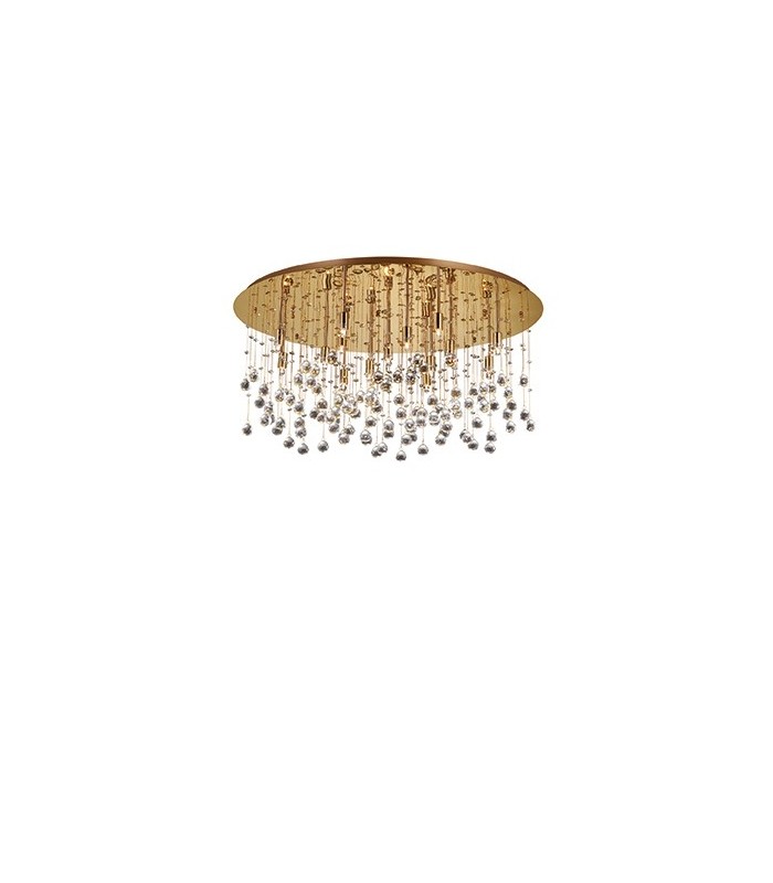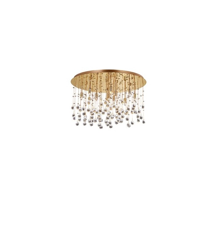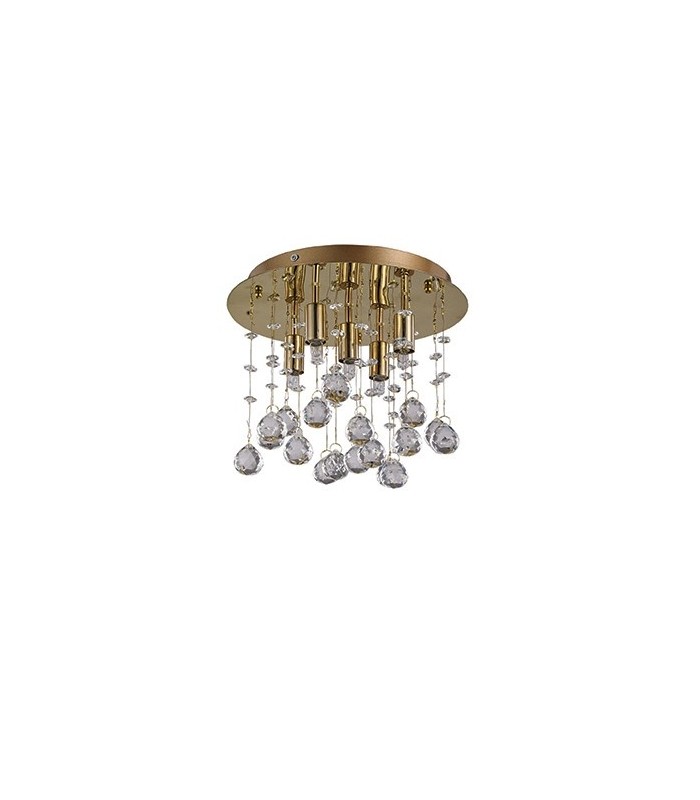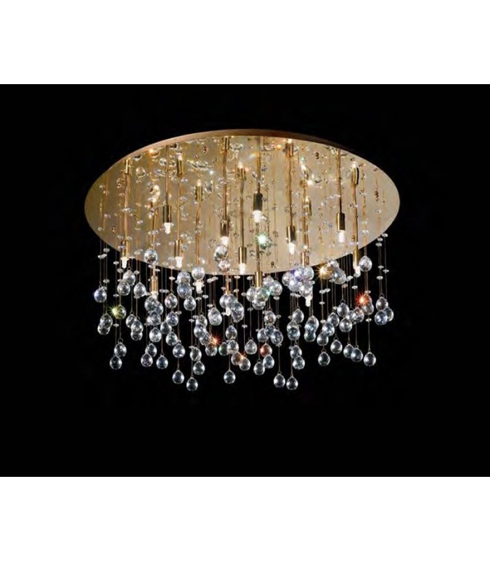 Ceiling lamp with metal frame finished in chrome or gold. Pendants made of crystal octagons and spheres. Available in the following versions: five, eight, twelve and fifteen lights.