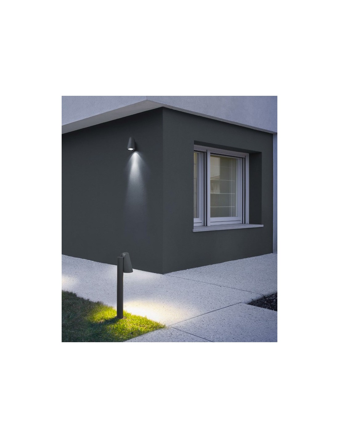 Outdoor bollard, die cast aluminium housing electrostatically painted in dark brown or in dark gray and transparent glass diffuser.
