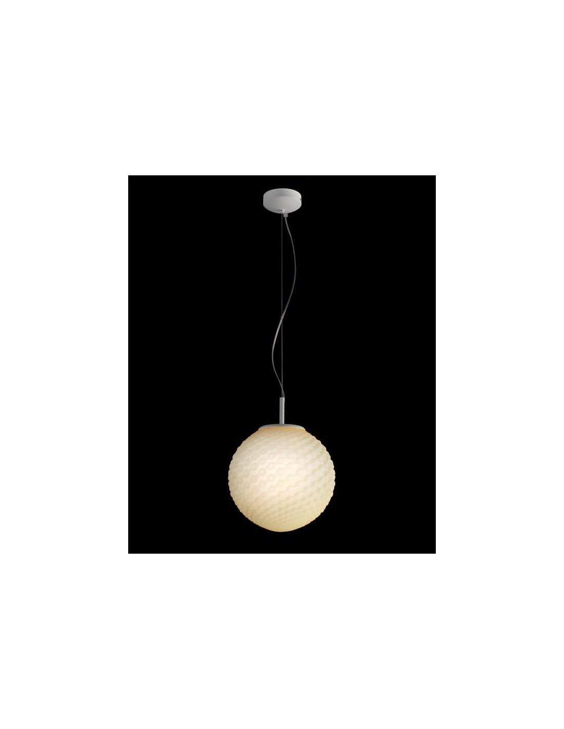 Domino features a frame in white painted metal and a spherical diffuser in blown glass characterized by a special alveolar processing in relief that fascinates with sophisticated games of protrusions and depressions, projecting suggestive shadows.