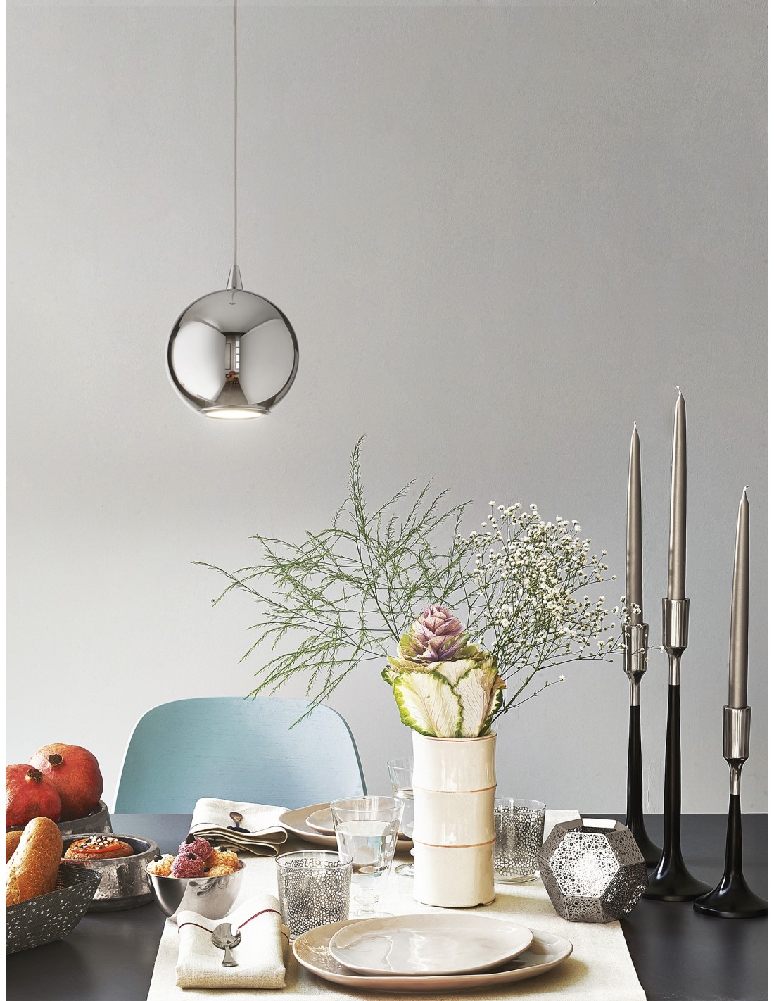 The BolDiodi one-light suspension lamp consists of a chromed metal frame, enriched by a mirrored finish, which houses the 3W LED light source with 3000K color temperature.