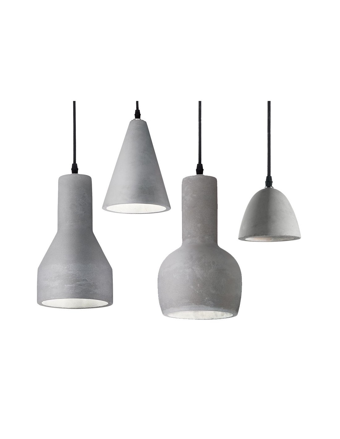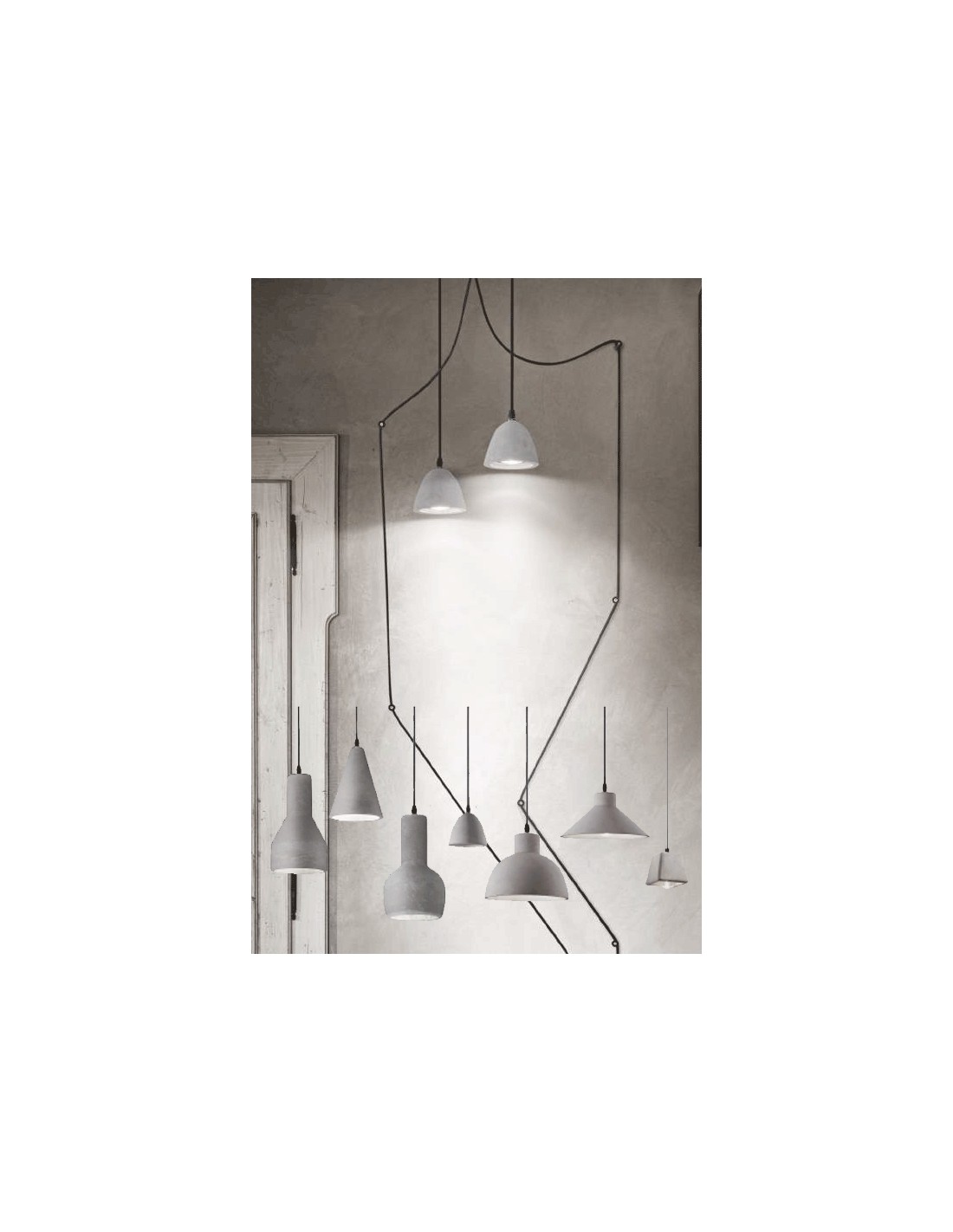 Suspension lamp consisting of a black metal frame and cement diffuser.