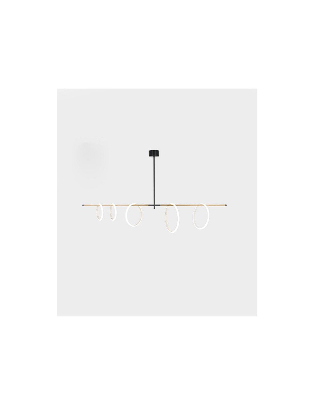 Led suspension lamp with central rod, metal structure finished in white and gold or black and gold. The special Rings, in opal white plexiglass with internal gold edge, are the lighting source. Available in the standard version or dimmable version. Integrated power supply.