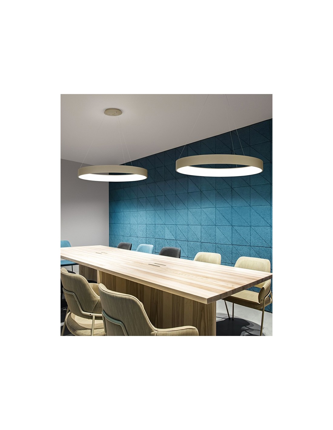 The Band Diodi suspension lamp by Affralux consists of a circular frame, in white painted satin aluminum or in sand, that houses the LED light source shielded by a screen in PMMA that achieves an excellent light distribution without glaring.