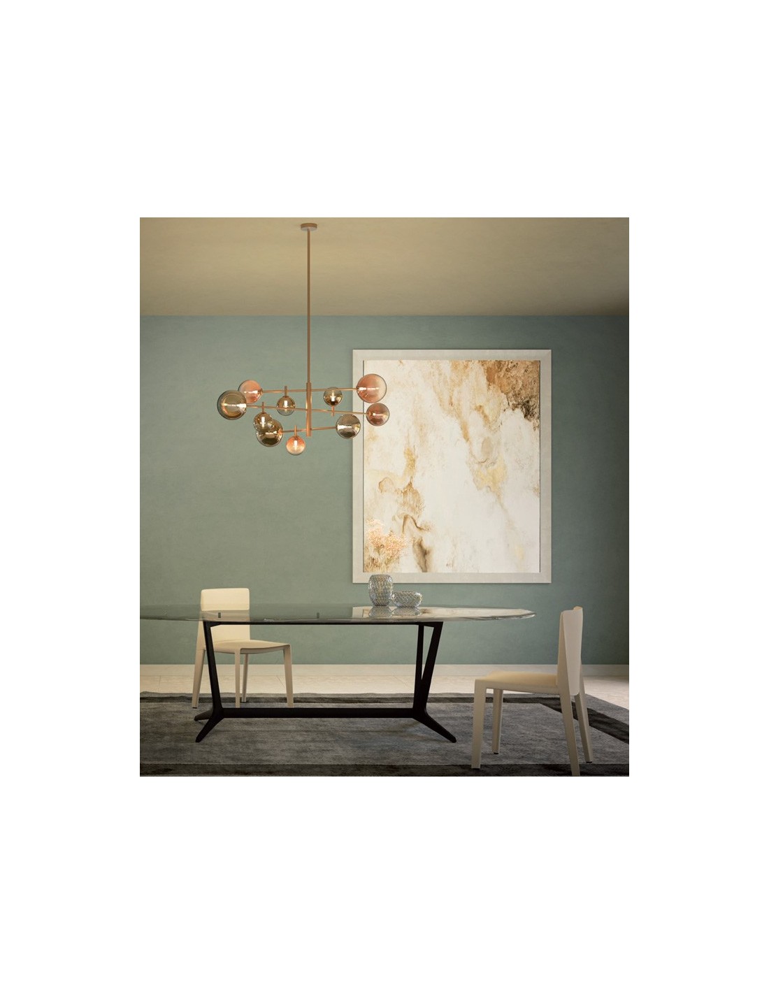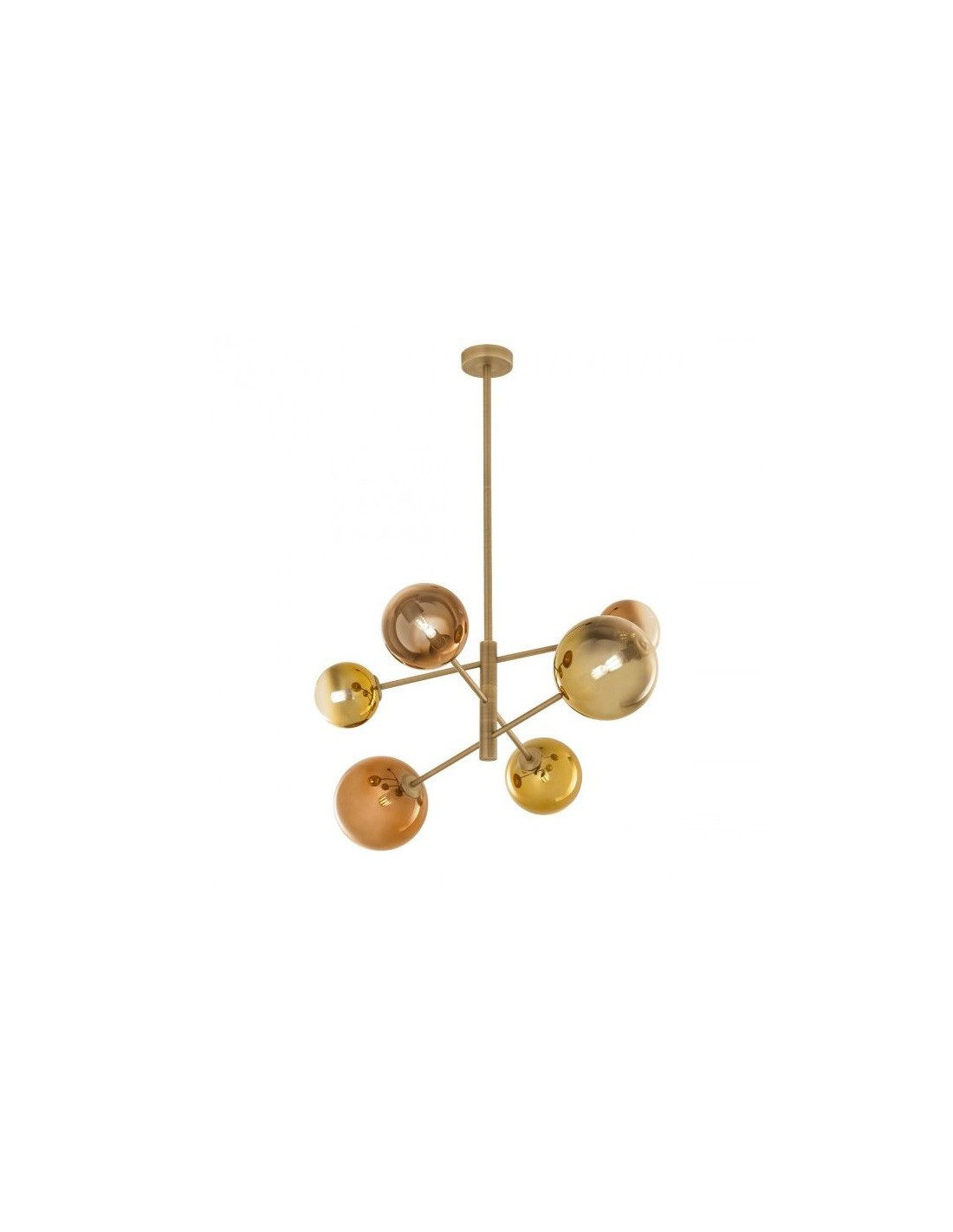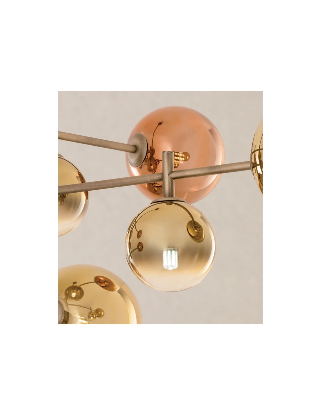 The diffusers in two different sizes alternate in three 15 cm spheres and two 18 cm spheres, a perfect balance of volumes and dimensions that creates harmony in the space. Thanks to the processing of the glass with a mirrored finish and the gold and coffee colors, the five diffusers complete the design of this lamp which takes on an original and elegant look.