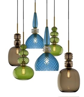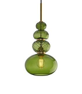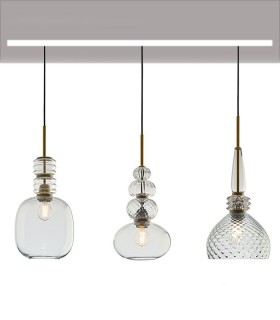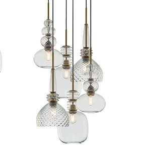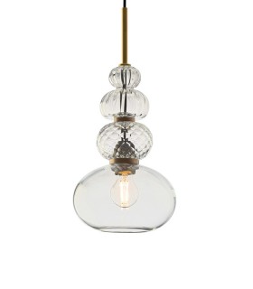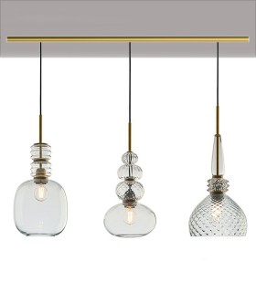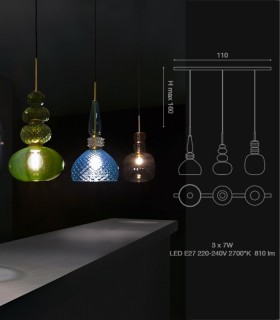 Sospensione a tre luci in vetro soffiato con montatura in foglia oro.
