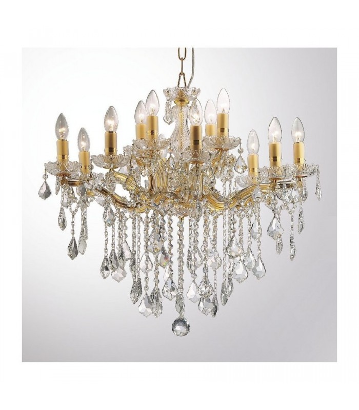 Florian è un lampadario con montatura in metallo disponibile con finitura dorata o in cromo. Corpo luce e bobeches in vetro decorato trasparente. Pendagli con elementi ottagonali e gocce finali in cristallo molato. Disponibile a sei, dodici e diciotto luci. Consigliato per illuminare ambienti con arredamento classico ed elegante.