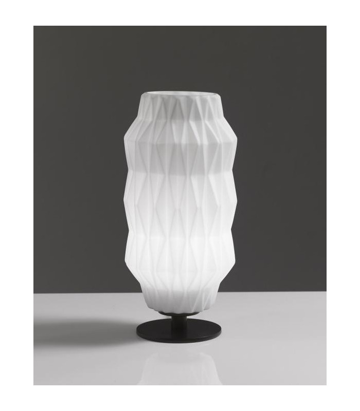 Selene Origami è una lampada da tavolo o da comodino composta da un prezioso diffusore in vetro soffiato che presenta una trama elegante e sofisticata ispirata allo stile liberty e da una montatura in metallo con base rotonda verniciata in nero.