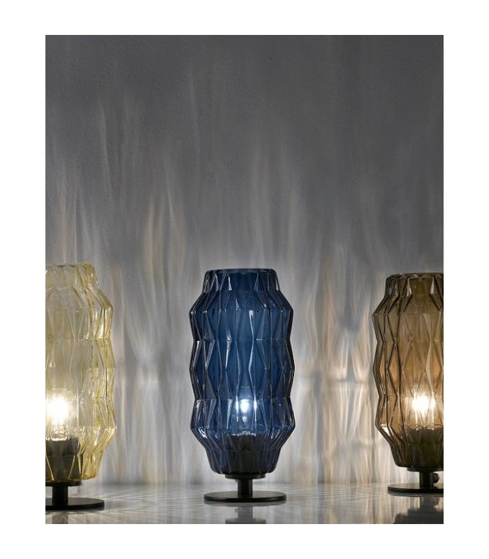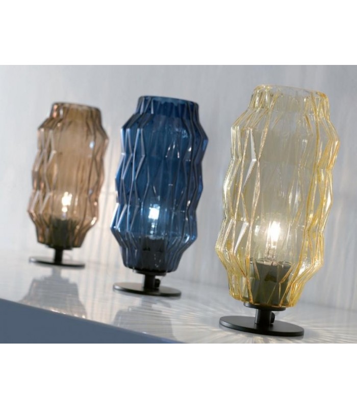 Lampada da tavolo o da comodino in vetro soffiato disponibile nei colori bianco, blu, trasparente, ambra e tortora.
