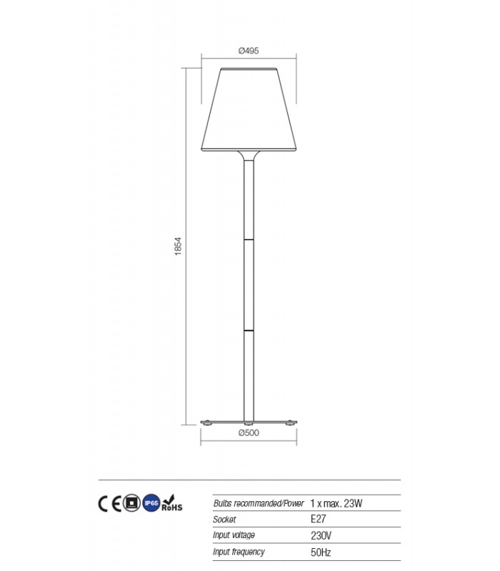 In questa versione Redo Pino lampada da terra ha un'altezza di 185 cm ed è composta da una struttura con base circolare in metallo verniciato a polveri di colore grigio opaco scuro. Il diffusore ha la forma tipica del paralume ma rivisitata utilizzando il polietilene bianco naturale. Si tratta di un materiale brevettato per durare nel tempo grazie alla resistenza ai raggi UV ma anche dalla facilissima manutenzione ordinaria.
