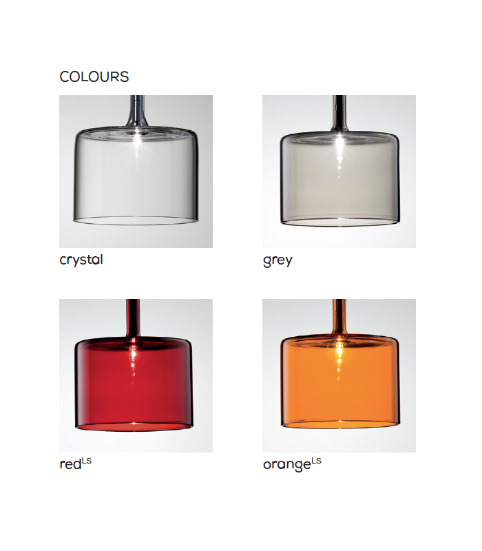 Disponibili anche plafoniere ad incasso a una luce (new), applique e lampade da tavolo h. cm 35 o cm 50 (new). I diffusori sono in vetro, proposti in tre diverse misure nelle tinte del cristallo, rosso e grigio.