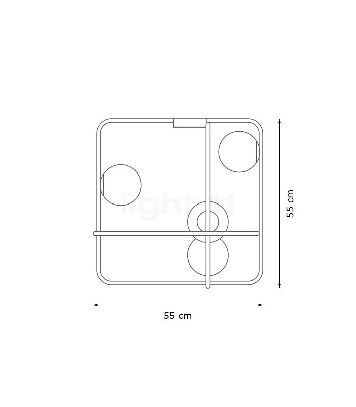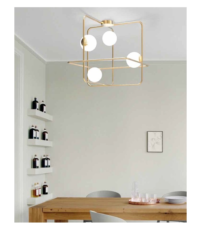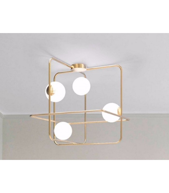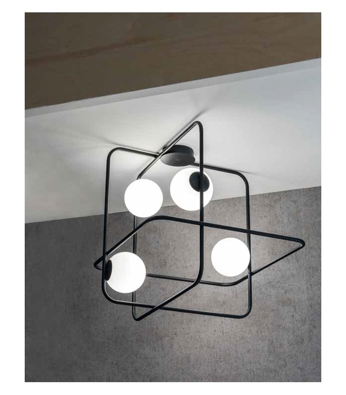 Marchetti Intrigo è una lampada da soffitto dalla forma quadrata composta da una struttura in tondino di metallo verniciato e lavorato a mano, mentre i quattro diffusori sferici in vetro bianco permettono alla luce di diffondersi in modo efficiente.