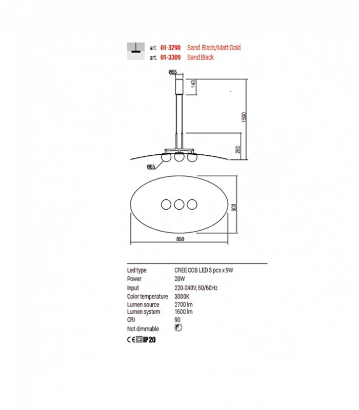 CODY SOFFITTO : H 154,0 cm, L 18,0 cm, CREE COB LED 1 pcs, 11 W, 3000K, 890 lm + H 159,0 cm, L 85,0 cm, CREE COB LED 3 pcs x 9W, 3000K, 2700 lm.