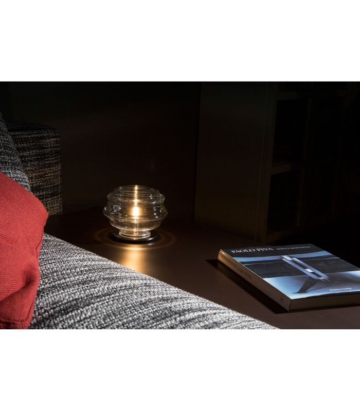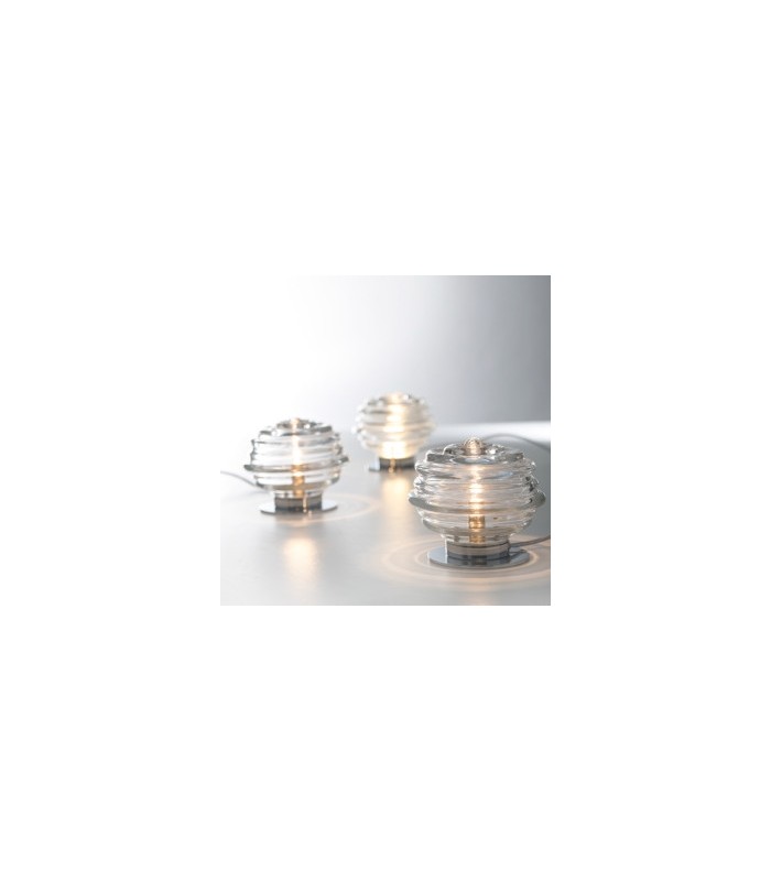 Mazzega 1946 Onda tavolo è composta da una struttura in metallo rifinita in cromo lucido e da un diffusore circolare e leggermente schiacciato nella parte superiore in cristallo trasparente lavorato a mano. Una tecnica di lavorazione paziente e artigianale che conferisce alla lampada unicità, preziosità e un effetto ottico sorprendente. Onda richiama un concetto semplice e poetico: il movimento dell'acqua sorpresa nella sua pazienza dall'irrompere del lancio di un sasso che genera in essa cerchi concentrici.