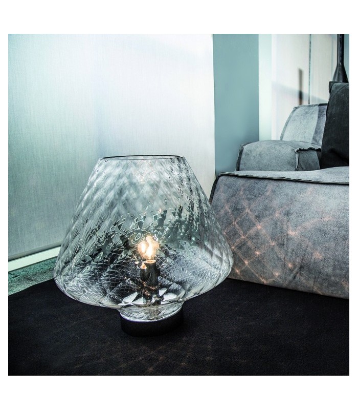 Lampada da tavolo o da comodino in cristallo trasparente lavorato a mano e con base in metallo cromato. Disponibile in due diverse misure.